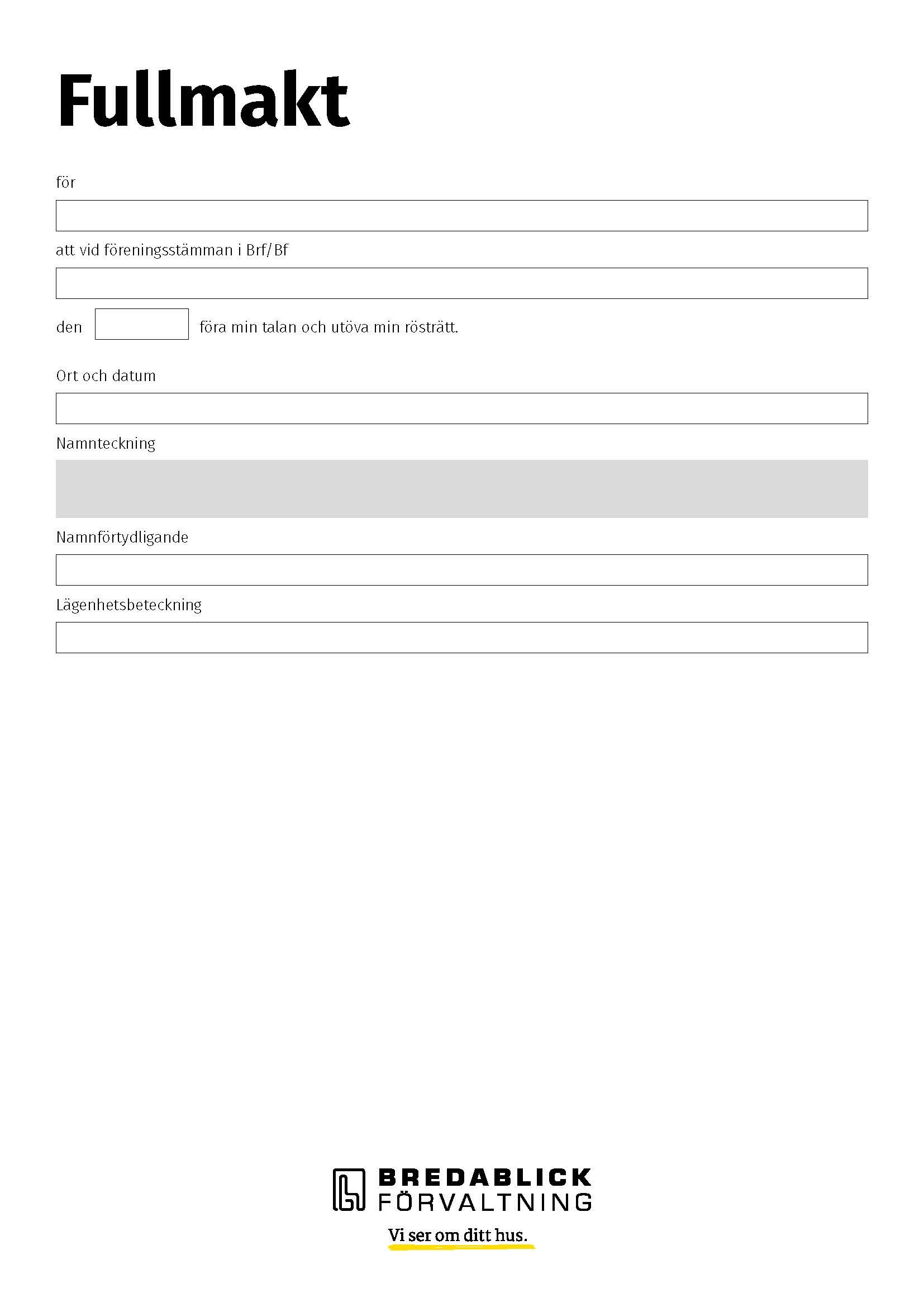 Ni väljer själva vem ni önskar som representant. Fullmakt kan enbart ges till en boende med rösträtt i föreningen Brf Gotthard 4 och gäller enbart för årsstämman (giltig i max 3 månader).